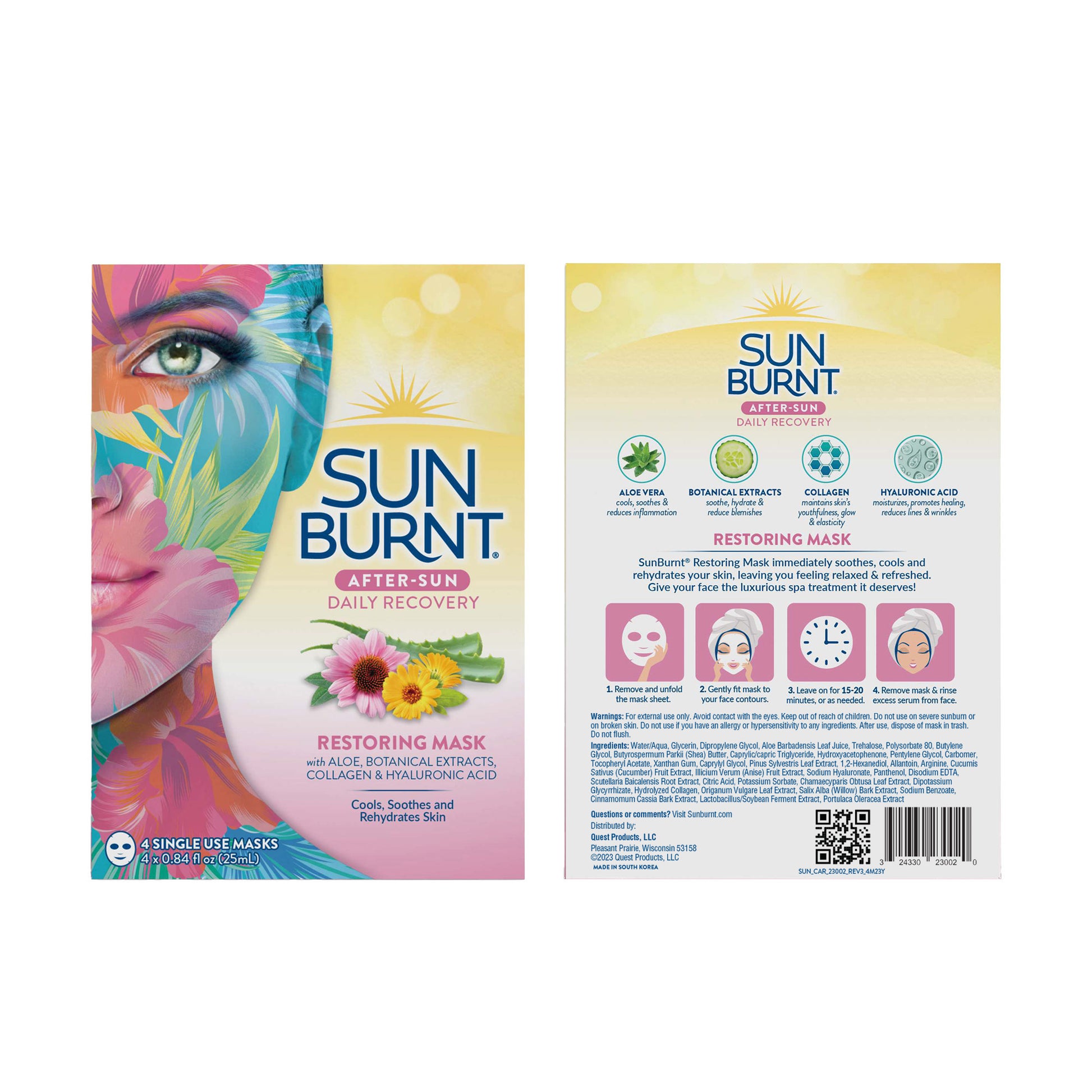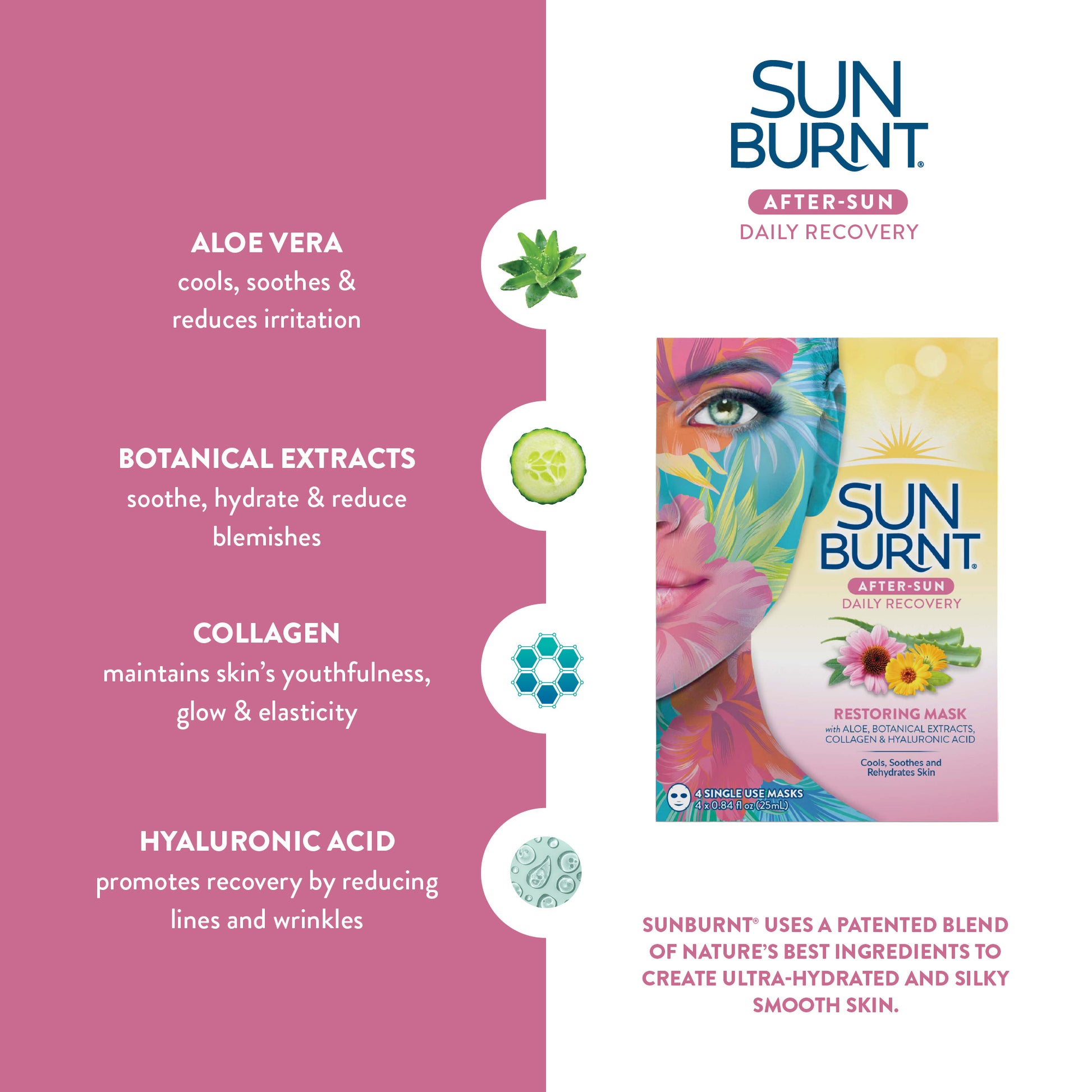 Experience ultimate hydration and relaxation for your sun-kissed skin with SunBurnt After-Sun Daily Recovery Restoring Mask. Our patented formula harnesses the power of nature’s finest healing and hydrating ingredients to leave your skin repaired, ultra-hydrated, and silky smooth. SunBurnt after-sun daily recover restoring mask blends aloe, botanical extracts, collagen and hyaluronic acid to deliver intense healing and hydration. Aloe vera, known for its soothing and anti-inflammatory properties, works to cool skin and reduce inflammation, providing instant relief from sunburn. The botanical extracts target blemishes, leaving your skin looking clearer and more radiant. Our masks also contain collagen to help maintain and restore the skin’s youthfulness, glow and elasticity; plus hyaluronic acid to deeply moisturize and heal the skin while reducing the appearance of lines and wrinkles. Just 15 minutes with our SunBurnt after-sun daily recover restoring mask and your skin will feel more rejuvenated and revitalized giving you a more youthful and hydrated complexion. Experience the power of nature’s healing ingredients and give your face the luxurious spa treatment it deserves.